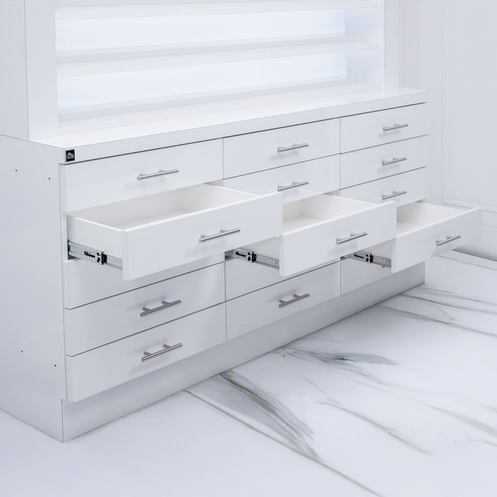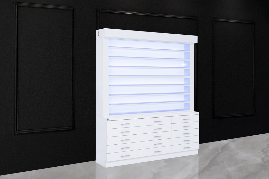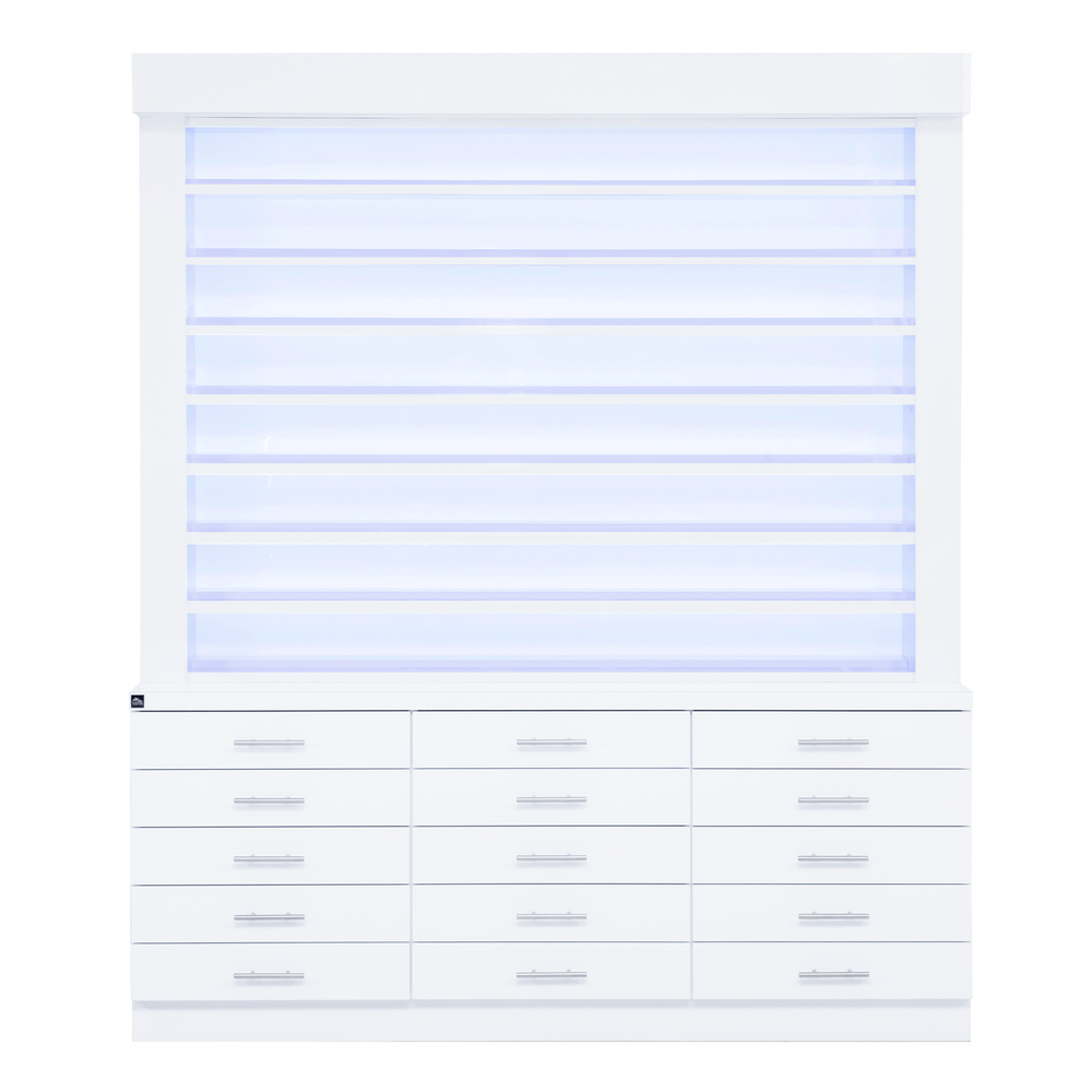 Show off your salon's extensive polish and dip powder selections with the new Single-Sided Double-Tier Polish Display and Cabinet. The double-layer shelving and built-in LED backlight make your colorful polishes and dip powders pop, while spacious drawers keep your everyday supplies organized.