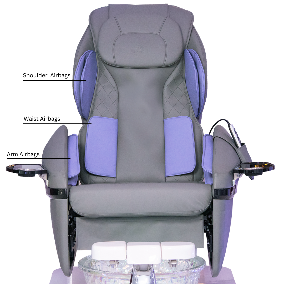 (The Omnia Freeform, Whale Spa's latest pedicure chair innovation, elevates any space with sleek LED accent lighting, creating an ambiance of modern luxury. Designed for ultimate comfort, it features an upper-body massage system with airbags targeting the arms, hips, and upper body. The chair’s plush, acetone-resistant upholstery sits atop the reliable Freeform platform base, combining elegance with durability. Thoughtful touches like sliding armrests, dual cupholders, charging ports, and purse hooks add convenience, transforming every visit into a relaxing and rejuvenating retreat.