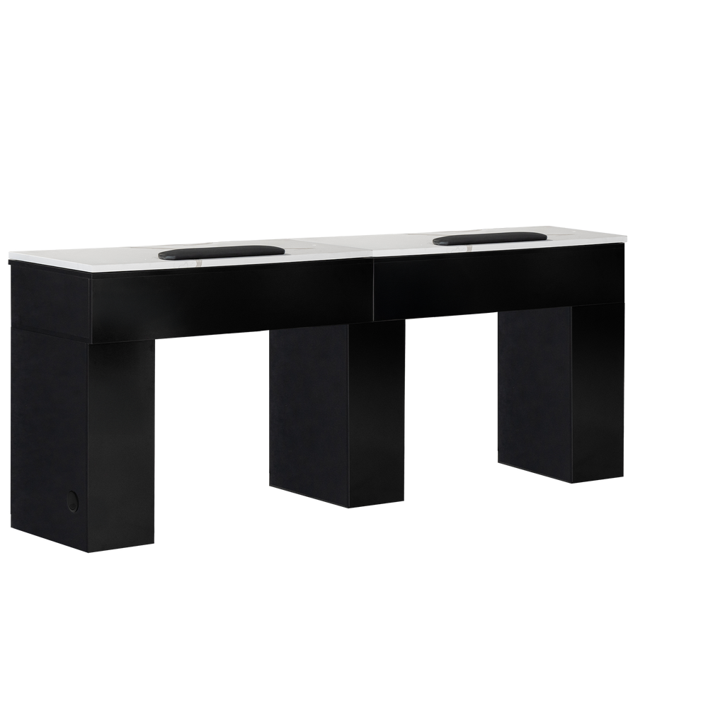The Mira Double Manicure Table is thoughtfully designed to bring comfort, functionality, and a modern look to any salon space. With an increased tabletop width, it offers more room for technicians to work efficiently. The adjusted height allows stools to fit neatly underneath, creating a more comfortable and streamlined setup.