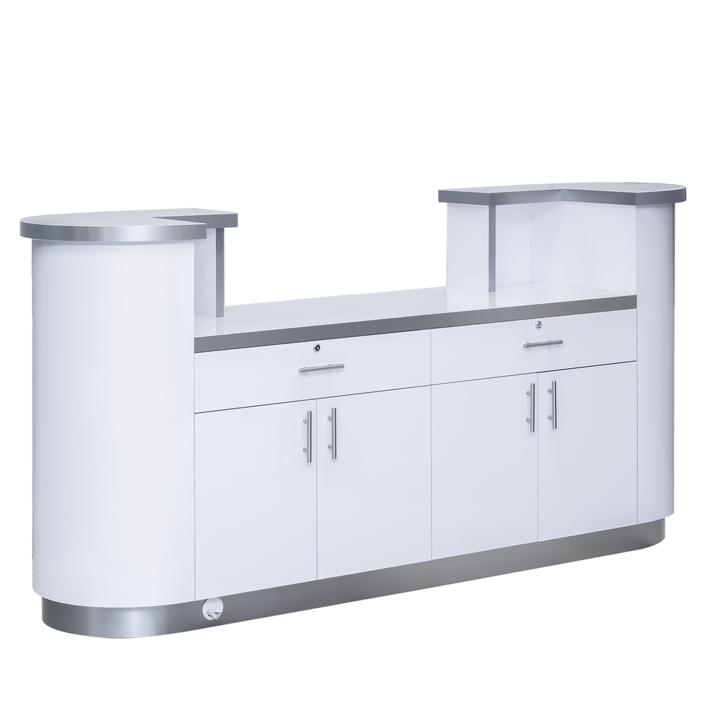 - This reception desk features cabinet doors and pull-out drawers