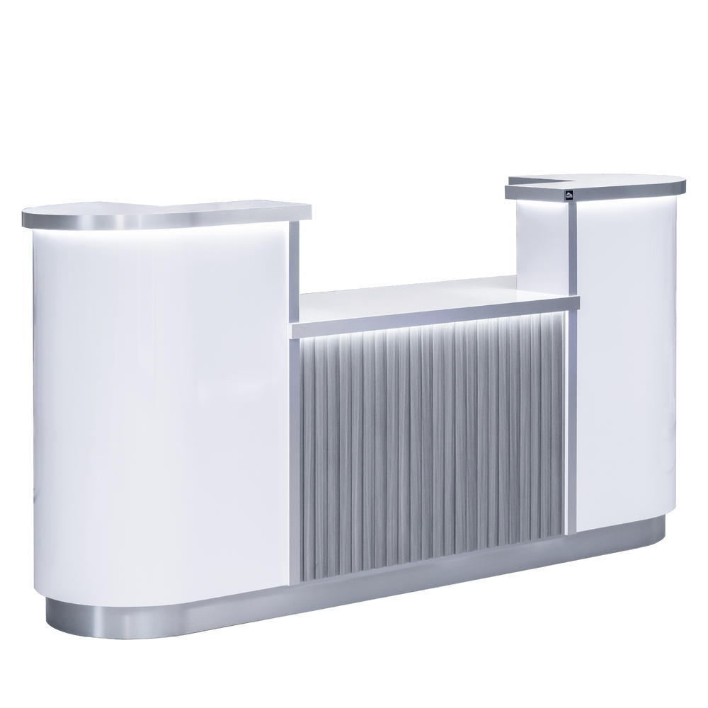 Make a great first impression with this stylish wood slat reception desk, designed to add both elegance and function to your salon or spa. The curved design offers a sleek, modern look, while the premium wood slats provide texture and warmth. Finished with your choice of trim color for a touch of luxury, it also features built-in LED lighting that creates a soft, inviting glow—enhancing both the design and ambiance of your space.